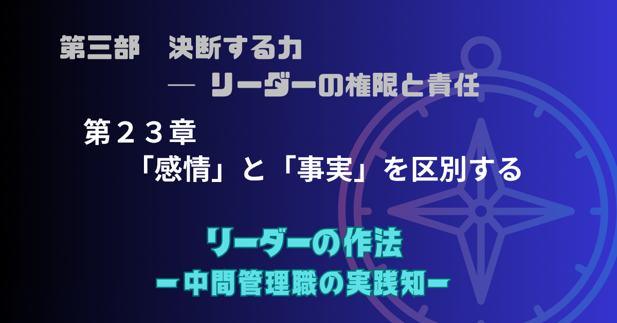 「感情や思い込み」と「事実」とを区別して扱うことだ。この「感情と事実の分離」というのはリーダーにとって非常に重要なキーワードなので、ぜひ大きな文字で紙に書いて壁に貼っておいてほしい。